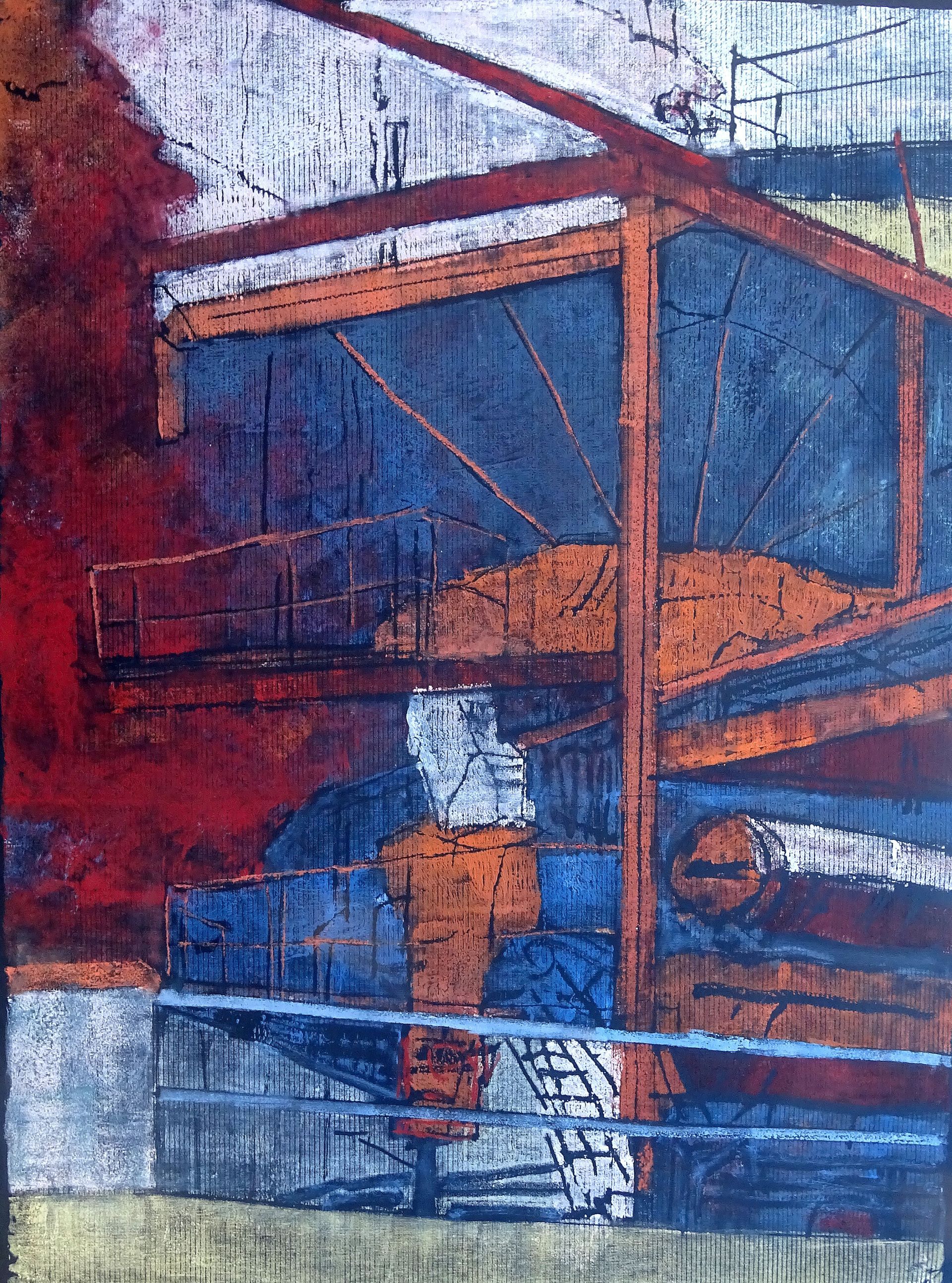 Es war nicht mein erstes Kieswerk, aber jenes von Niederweimar, unweit von Marburg, wurde zu einem guten „Arbeitsraum“. Manchen aus unserer Zeichnen-Gruppe der „Sommer-Akademie“ wäre ein schöne Landschaft als Thema allerdings lieber gewiesen. Aber mir kam das Sujet „Kieswerk“ gerade recht. Die Kombination von verschiedenen Sand- und Kieshügeln mit Laufbändern und Mahl- und Zerkleinerungsanlagen war eine respektgebietende, aber technoid anregende Umgebung und eröffnete mir vielfältige zeichnerische Perspektiven. Sie mündeten dann in eine Gruppe von Mischtechniken in denen ich auch Papiercollage-Elemente verwendet habe. Das nebenstehende Bild gibt keine konkrete reale Situation wieder, sondern kombiniert verschiedene gesehene oder gezeichnete Strukturen in einer sandfarbigen Grundstimmung. Und Rost gibt es in den verschiedensten farblichen Abstufungen.
