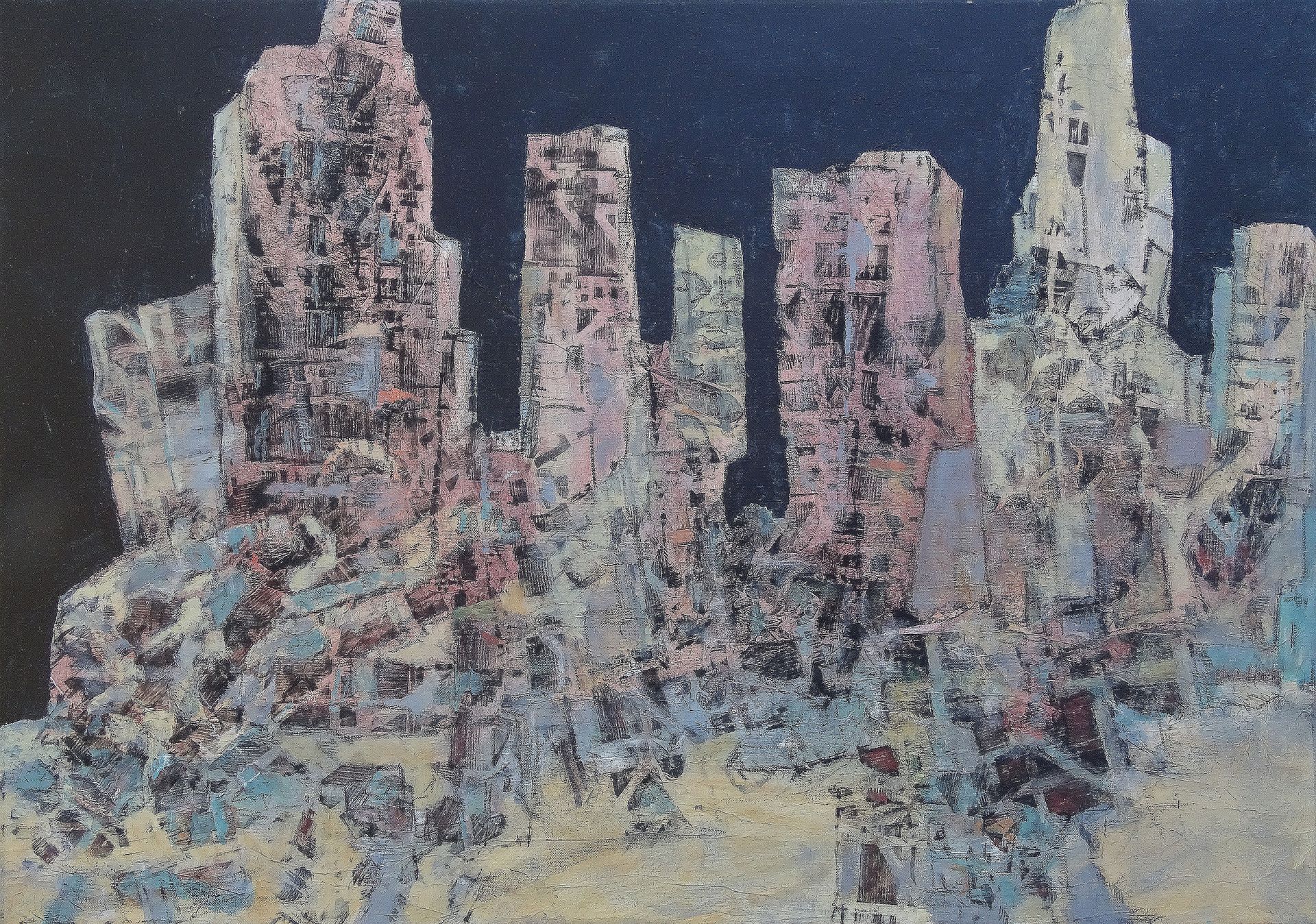 Organische Gebäude, 2016 Wie die Zukunft ökologischen Bauens aussehen sollte, auch darüber scheiden sich die Geister in Architektur und Städtebau. Am besten wäre es natürlich, wenn es ein organisches Wachstum von Bauten geben könnte. Das ist allerdings bislang nur in Science-Fiction-Welten möglich. Digital lässt sich da einiges machen. – Das scheinbar organische Wachstum der Gebäude in diesem Bild geht auf Frottage-Elemente zurück, die miteinander montiert wurden. Zusätzlich wurden die Gebäude-Strukturen farblich ausgearbeitet und mit schwarzer Acryl-Farbe umgeben. – Eine Mischtechnik auf Leinwand im Format 80 x 100 cm.