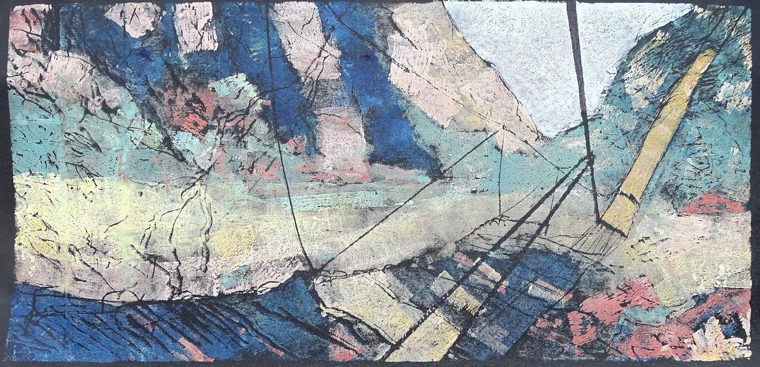 Was ist das denn?, November 2021 Das Ausgangsbild war ein Foto über einen Wanderweg im Engadin im "Reiseteil" einer Tageszeitung. Soweit überhaupt erkennbar, waren darauf Konturen einer Hängebrücke zu sehen. Aber für mich war es eher eine farbliche Abstrak-tion mit Elementen von Landschaft und grafischen Anteilen aus Seilen und Holzteilen. Die Umsetzung in den Handdruck erfolgte seitenverkehrt und in vier farblichen Varianten auf schwarzer Leinwand im Formt 60 x 120 cm.