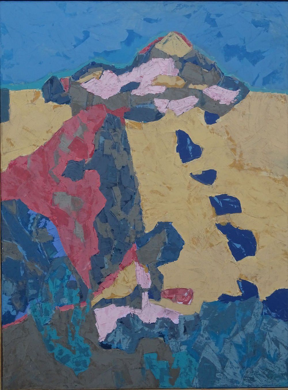 Landschaft, abstrahiert, 2000er-Jahre Es gab Zeiten, in denen ich Bilder nicht benannt, nicht datiert und nicht mit „Autogramm“ versehen habe. Daher weiß ich nicht mehr genau, wann ich dieses Tryptichon gemacht habe. Sicher jedoch ist, dass ich es in Spachtel-technik auf Leinwand gemacht habe. Der Auftrag der Acrylfarbe mit Spachteln und Palettenmessern führt zu leicht schrundigen, kantigen Farbfeldern. Für eine Landschaft, die vom Vulkanismus geprägt ist, schien mir das die passende Maltechnik zu sein. Die Gipfelformen sind inspiriert von den Vulkanen auf Lanzarote oder vom Pico del Teide auf Teneriffa – ebenso wie Lava-Klumpen und riesige Basalt-Brocken, die die ehemals aktiven Vulkane „ausgespuckt“ haben. Die Farbwahl auf den Bildern hat allerdings gar nichts mit Vulkanismus zu tun.