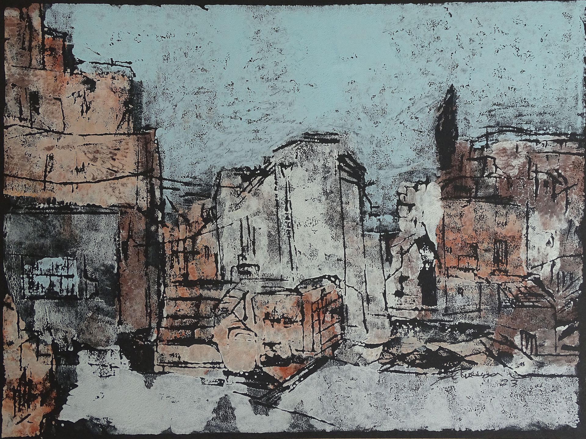 Der Handdruck oben basiert auf einem Foto, das ich 2013 vor Ort gemacht habe. Auch ein paar Zeichnungen konnte ich damals anfertigen. Die Zeit vor Ort war kurz, die Beschäftigung mit dieser Stadt, die wie eine riesige steinerne Bühne wirkt, aber hielt an. Mit den Fotos einer Freundin, die den Ort intensiver erkundet hatte, bin ich 2023 noch einmal tiefer in das „Thema Matera“ eingestiegen. Es wurde eine Mischung von realen Szenen und urbanen Phantasien, in dem manches "farbiger" erscheint als in der "Wirklichkeit". Einiges ist hier „Synthese“ aus durchaus typischen Ecken und Blicken in einem Gewimmel aus Gebäuden und dem Auf und Ab von Treppen und steilen Gassen.