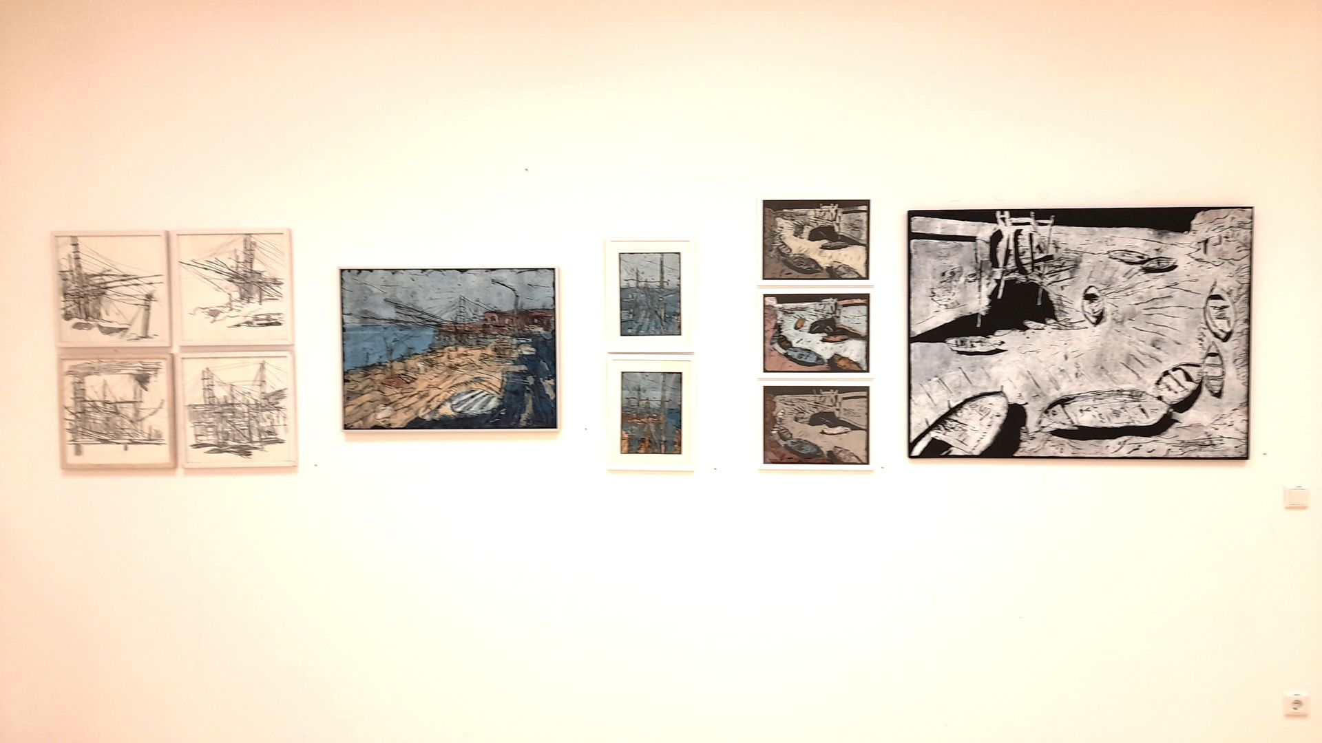 Auf dem kleinen Foto oben ist meine Wand mit fünf großformatigen Mischtechniken/Collagen zu sehen, im mittleeren Foto ein großer Raum mit malerischen und zeichnerischen Werken von Conny Barthold (links und hinten) und mit Malerei mit Acryl und Wachs von Gabi Herlitz (rechts) zu sehen. Im Foto darunter eine Wand mit meinen Zeichnungen und Handdrucken rund um Fischfanganlagen und Fischer-Booten.