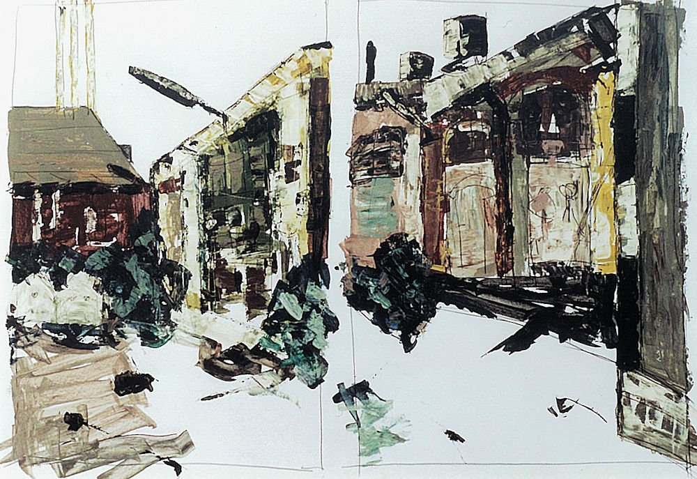 Die ersten kleinen Mal-Spachtel fand ich in einem Ölfarben-Kasten. Die Ölfarben benutzte ich nicht lange, weil mir die Lösungsmittel „stanken“. Aber die Spachtel sind auch für den Auftrag von Acrylfarbe geeignet. Im Gegensatz zum Pinselduktus führt der Farbauftrag mittels Spachteln zu reliefartigen, leicht kantigen Strukturen. Der Imagination von Bauwerk, Architektur und Stadt kommt die Spachtel-Technik zugute. Bei Landschaften wirkt die Natur wirkt dann geometrischer, abstrakter.